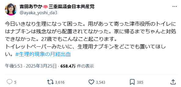 2025年3月25日に三重県議会議員の吉田あやかさん(@ayaka_yoshi_da3)が投稿した内容が、ネット上で大きな議論を巻き起こしています。生理用品の公共施設での提供について、賛否両論が飛び交う中、この問題が私たちに投げかける課題とは何でしょうか?さっそく見ていきましょう。